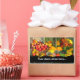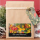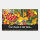 A colourful harvest time sticker with fruits and vegetables, flowers and leaves by a wooden fence, add the text of your choice.