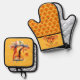 Fun Fall Pumpkin Harvest oven mitt and pot holder set - Oven mitt has a pattern of pumpkins at the bottom against a mustard yellow orange background. The top cuff has a display of pumpkins and fall leaves. A modern font is used to personalise the oven mitt with your name. The pot holder has a pair of rubber rain boots with fall foliage leaves around them and a puddle. There are also two kitchen towels and a coordinating apron in our shop.