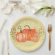 Pretty Autumn themed plates features a trio of watercolor pumpkins with branches of fall leaves on light burlap background.