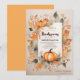 At the heart of the invitation, two majestic pumpkins take centre stage, exuding both abundance and the warmth of the harvest season. They serve as a symbol of the bountiful feast that awaits your guests. Surrounding the pumpkins, delicate fall leaves, resplendent in their autumnal hues, create a picturesque frame, adding a touch of rustic charm to the design.