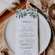 Our rustic chic wedding or special event menu features your starter courses, entrees and desserts accented with a spray of watercolor leaves in rich shades of hunter, sage and forest green. "Menu" appears at the top in elegant calligraphy lettering. Coordinates with our Harvest Sage wedding collection.