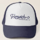 This trucker hat features the text Harwich, Massachusetts in a navy blue nautical font. A minimalist design that boasts the name and state of the Cape Cod town.