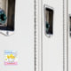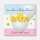 A chick hatching in the centre of the image. The top banner in light sky blue with customisable text and the bottom pink banner with customisable date text.