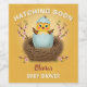 Adorable baby shower wine label featuring a sweet yellow chick hatching from a blue eggshell in a cosy nest, surrounded by delicate pink spring blossoms.