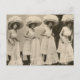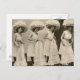Silly vintage photograph of four girls standing in line wearing big hats and holding their petticoats in front of them