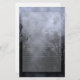 Halloween stationery with faint grey lines against a spooky Halloween sky with misty trees along a dark haunted road, gothic ravens and a cloudy full moon with a blue mist.