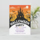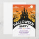 A classic Halloween invitation featuring a haunted castle, twisted trees, and flying bats for a spooky night.