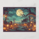 A mysterious Halloween postcard featuring a moonlit forest path lined with pumpkins and old graveyards, a perfect blend of eerie and magical vibes.
