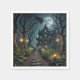 A cobblestone path winds through a dense, eerie forest illuminated by glowing street lamps, leading to a grand, Victorian-style mansion under a full moon.