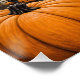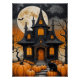 A spooky silhouette of a haunted house stands against a vibrant, full moon. Bare, gnarled trees reach like skeletal fingers toward the sky, while glowing jack-o'-lanterns dot the yard. A black cat, a familiar spirit of the season, sits in the foreground, its eyes reflecting the eerie light. The artwork is dominated by a striking black and orange color palette, perfect for setting a classic Halloween mood.