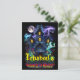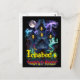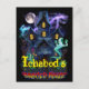 Spooky haunted house scene with ghosts, full moon and a spooky Halloween night scene. Fun illustrated design features vibrant tones of blues and purples with 'HAUNTED HOUSE' printed in red and yellow on bottom of design.
