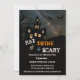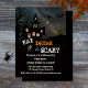 Halloween dinner party invitation featuring a haunted house on a hill at night, with spider and bats ...