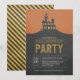 This spooking halloween party invitation features a haunted house illustration.