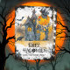This Halloween flat card showcases a haunted house with spooky trees, a witch, bats, a raven and a fool moon and the text 'HAPPY HALLOWEEN' in cool typography. Adding to the spooky theme, there are also grey crosses. There is a black grunge border around it. The back includes a witch pattern.