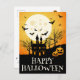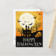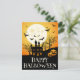 Haunted House Happy Halloween design features a spooky haunted house and tree silhouettes, full moon, bats, and pumpkins illustrations. Personalise with your custom text. Unique and original design by Golden Bloom Home.