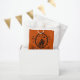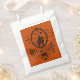 Happy Halloween favour bag with black line drawing of a haunted house on orange background.
