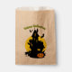 Fun Halloween trick or treat bag with a haunted house which has a belfry with bats flying around it. A scary black cat and a carved jack-o-lantern in the front yard and a full moon in the background. Arched over the top in bold bright green lettering is Happy Halloween.