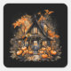 Stickers with a cool and spooky illustration of a wooden haunted house. Surrounded by big orange pumpkins and trees with orange leaves. Windows with orange lights add a nice glow. Fun Halloween design.