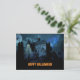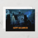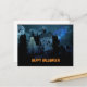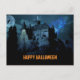 Halloween themed postcard features artistic digital painting of scary haunted mansion on the hill with dark blue and grey skies. Customisable grunge style text overlay