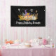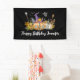 Birthday banner with a cute image of a haunted pumpkin house with a big witches hat on top and ghosts and bats flying around.