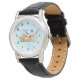 A watch with a cute image of a haunted pumpkin house with a big witches hat on top and ghosts and bats flying around.