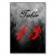 A custom double-sided table card with grunge script text front and back and art of a spooky Halloween sky with misty trees along a dark haunted road, gothic ravens and a cloudy full moon in black, white and grey.. Customise It to change fonts, colours, even save your design for later.