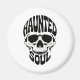 Bold black-and-white skull with curved 'Haunted'/'Soul' typography; high-contrast gothic motif for Halloween, rock, and streetwear fans seeking fearless edge.