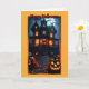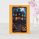 Set the perfect Halloween mood with this atmospheric greeting card featuring a classic haunted house. The scene captures the eerie essence of Halloween night, with the dark, looming house surrounded by glowing jack-o'-lanterns that light up the pathway. The house, with its pointed gables and flickering windows, is adorned with spooky decorations and bat silhouettes flying under a full moon, adding to the creepy ambiance. The "Happy Halloween" message is prominently displayed in bold red and black at the top, complementing the spooky vibe.