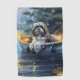 Set sail into the magic of the holiday season with this beautifully detailed illustration, showcasing a proud dog sitting in a festively decorated boat, gliding across a serene Christmas lake. The twinkling lights from nearby pine trees reflect off the water, casting a warm, festive glow that enhances the cosy ambiance. Ornaments dangle from the boat's sides, while glowing lanterns light the way, creating a scene that captures the true essence of Christmas warmth and joy. This nostalgic artwork brings a touch of holiday magic to any space, perfect for those who cherish the spirit of the season.