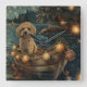 Set sail into the magic of the holiday season with this beautifully detailed illustration, showcasing a proud dog sitting in a festively decorated boat, gliding across a serene Christmas lake. The twinkling lights from nearby pine trees reflect off the water, casting a warm, festive glow that enhances the cosy ambiance. Ornaments dangle from the boat's sides, while glowing lanterns light the way, creating a scene that captures the true essence of Christmas warmth and joy. This nostalgic artwork brings a touch of holiday magic to any space, perfect for those who cherish the spirit of the season.