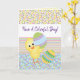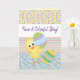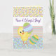 Bright and cheerful. This card is full of spring colours and fun patterns. In the centre three's an adorable baby chick with Easter eggs. There's a text box on the inside for you to add your own message.