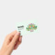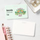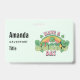 Name tag with a St. Patrick's Day themed image. A retro grunge style design which says: Have a lucky day. With a colourful rainbow behind. Words written in a fat rounded retro style vibe. Pink and green colours.
