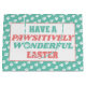 Introducing our delightful Easter design featuring a charming border of white paw prints on a soothing mint green background. Embrace the joyful spirit of Easter with this design, which encloses a clean white background showcasing the whimsical text "Have a pawsitively wonderful Easter." The text is elegantly presented in refreshing mint green and light pink colours, with the letter "o" in "wonderful" playfully substituted with a paw print.