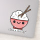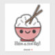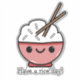 Cute cut sticker featuring an adorable pink bowl of white rice. The bowl has a happy kawaii face and the rice has two chopsticks stocking out the rive. Below is a play on words saying Have rice Day! in black text.