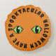This round pillow has holiday message for your guests. The centre has green eyes and message, in orange, reads "Have A Spooktacular Halloween". The back is orange, with black text.