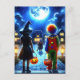 Scary Halloween postcard with ai art depicting a little boy and girl in a clown and witch costume walking out the house to encountered a scary monster at the end of their sidewalk.