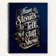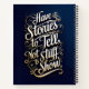 This beautiful spiral-bound notebook features an inspiring typographic design that encourages you to embrace adventure and live life to the fullest. The navy blue background provides a rich, elegant canvas for the warm, golden-hued lettering that reads "Have stories to tell, not stuff to show."