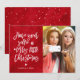 Cute and fun holiday Christmas card featuring the phrase "have your selfie a merry little Christmas" in a handwritten script typography on a red grunge background. Your selfie photo is displayed on the opposite side. The back features a red grunge background with a falling snow pattern.