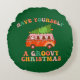 Cool retro van with Santa driving. A Christmas tree on top of the van. The van has Christmas lights.