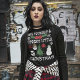 This wonderfully creepy graphic tee offers up a goth style spin on traditional Christmas motifs with snowflakes and star shapes formed out of white skeleton bones, skull shaped Christmas ornaments and holly berries, spooky Christmas wreaths and trees and ghoulish ornaments and snowmen. My illustrations in green, grey, red, and white are set against a black background. My graphics accompany the slogan HAVE YOURSELF A SPOOKY LITTLE CHRISTMAS spelled out in distressed white skull and bone shaped letters.