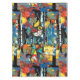 A whimsical cat with a geometric, stained-glass appearance stands in a vibrant forest of birch trees. The background features a colourful blend of autumn leaves and hues of blue and yellow. Digital Art Photoshop