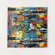 A whimsical cat with a geometric, stained-glass appearance stands in a vibrant forest of birch trees. The background features a colourful blend of autumn leaves and hues of blue and yellow. Digital Art Photoshop