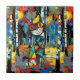 A whimsical cat with a geometric, stained-glass appearance stands in a vibrant forest of birch trees. The background features a colourful blend of autumn leaves and hues of blue and yellow. Digital Art Photosho