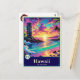 The artwork transports you to the heart of paradise, showcasing swaying palm trees, golden beaches, and dramatic ocean sunsets. With bold lines and vivid colours, the cel-shaded design adds depth and energy to every detail, from the crashing waves to the rich greenery of the rainforest. The state name and city are elegantly displayed, making this postcard both a visual delight and a timeless keepsake for those who’ve visited or dream of Hawaii’s enchanting shores.