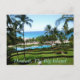 This Hawaiian postcard  shows the beautiful daytime ocean view, looking towards Hapuna Beach from the lobby of the Hapuna Prince Resort, one of many beautiful resorts along the Kona-Kohala coast on the western side of the island of Hawaii -- "The Big Island". This is the island known for snow topped Mauna Kea with its observatory, lava fields, wide open ranch space, and tropical rainforests.  13 different climate zones all on one island in the Pacific Ocean.