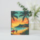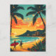 A festive postcard featuring a tropical Hawaii Christmas with surfers in Santa hats, palm trees, and a golden sunset beach scene. A fun and unique holiday greeting card.