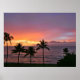 Tropical sunset photo from Hawaii on the island of Maui. Picture is of palm trees in silhouette with beautiful sky of pink, purple and orange and distant mountains with a purple ocean. This beautiful picture of paradise will make you think of warm tropical breezes on the beach.