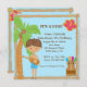 Start your celebration off right with this adorable Luau invitation. Whether it's a backyard barbecue or a kids birthday party this is the perfect invite for you! It has a teak wood frame with a palm tree in the left corner. There's this adorable Hula boy playing a ukulele standing next to the tree. In the top right corner there is a red hibiscus flower. Extra postage may be needed for this size. Check out the many other designs and products in this line. ©JW Illustrations