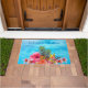 Hawaiian flowers and pineapples welcome mat for the front door. Blue ocean water background with tropical design and line of custom text along the top.