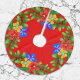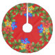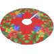 Hawaiian flowers bright red Christmas tree skirt. Illustrated big floral images with green holly leaves make a decorative border around tree skirts with fabric options.